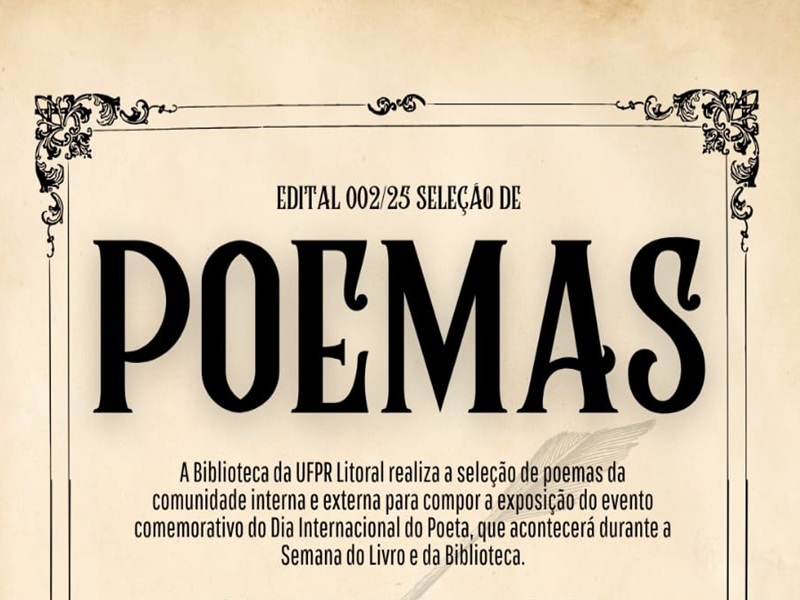 Em comemoração ao Dia Internacional do Poeta, a Biblioteca Litoral (UFPR) convida toda a comunidade interna e externa a participar de uma seleção de poemas autorais! Os poemas serão expostos durante a Semana Nacional do Livro e da Biblioteca na última semana de outubro. 📅 Datas importantes:– Inscrições: 01 a 10 de outubro– Resultado: 17 […]