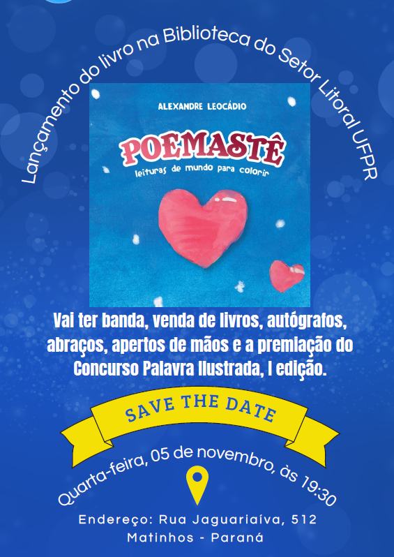 No dia 05 de novembro, o escritor e doutorando no Programa de Pós-graduação em Desenvolvimento Territorial Sustentável (PPGDTS), Alexandre Leocádio irá lançar o livro Poemastê e anunciar os vencedores do Concurso Palavra Ilustrada – I edição, promovida em parceira com a Biblioteca do Setor Litoral. Ilustradores e ilustradoras que participaram Concurso Palavra Ilustrada, I edição vão ganhar um exemplar.