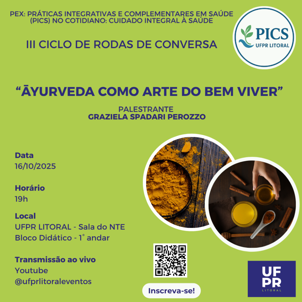 ✨ Nesta roda, vamos conversar sobre a Áyurveda como caminho para o cuidado integral à saúde, com a presença da palestrante Graziela Spadari Perozzo.