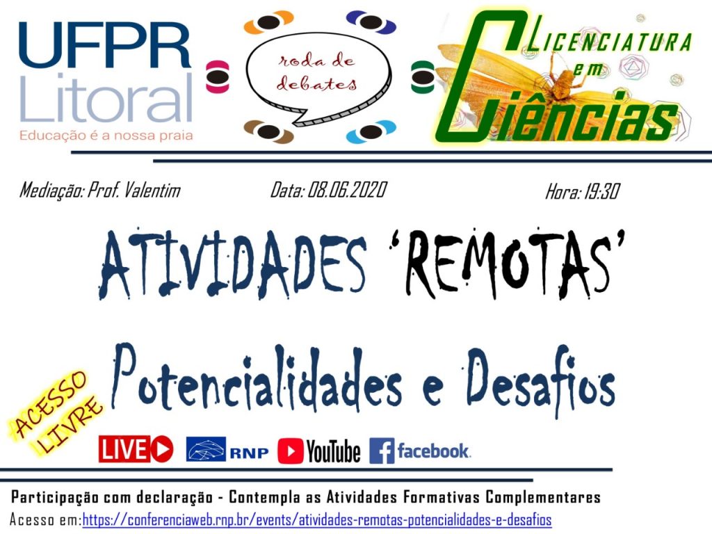 Nesse sentido, o Curso de Licenciatura em Ciências convida toda a comunidade acadêmica da UFPR Litoral e demais interessados para participarem da Roda de Debates: Atividades ‘Remotas’: Potencialidades e Desafios, que será realizado no dia 08 de Junho de 2020, as 19:30hrs sob mediação do Prof. Valentim.
