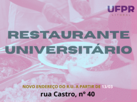 A UFPR Litoral informa que o Restaurante Universitário (R.U.) de Matinhos mudará de endereço. A partir do dia 13 de março de 2026, o atendimento será realizado no seguinte local: Rua Castro, nº 40, esquina com a Rua Rio Negro (antigo Bar do Silvino). Até o dia 12 o R.U. funcionará no endereço atual.