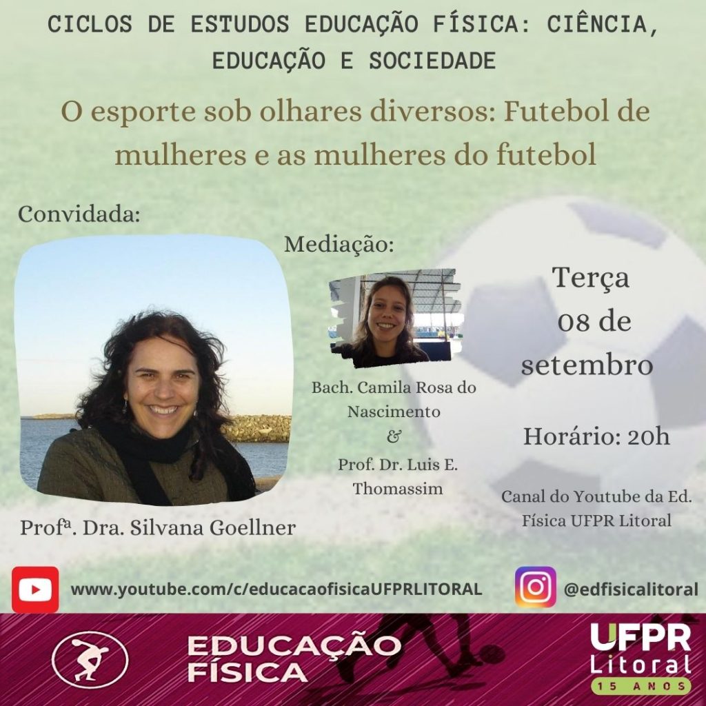 Nesta 3a feira, dia 8/9, às 20h, o Ciclo de Estudos em Educação Física: Ciência, Educação e Sociedade traz a convidada Profa Dra. Silvana Goellner (UFRGS), que vai abordar o tema O Esporte sob olhares diversos: futebol de mulheres e as mulheres do futebol.