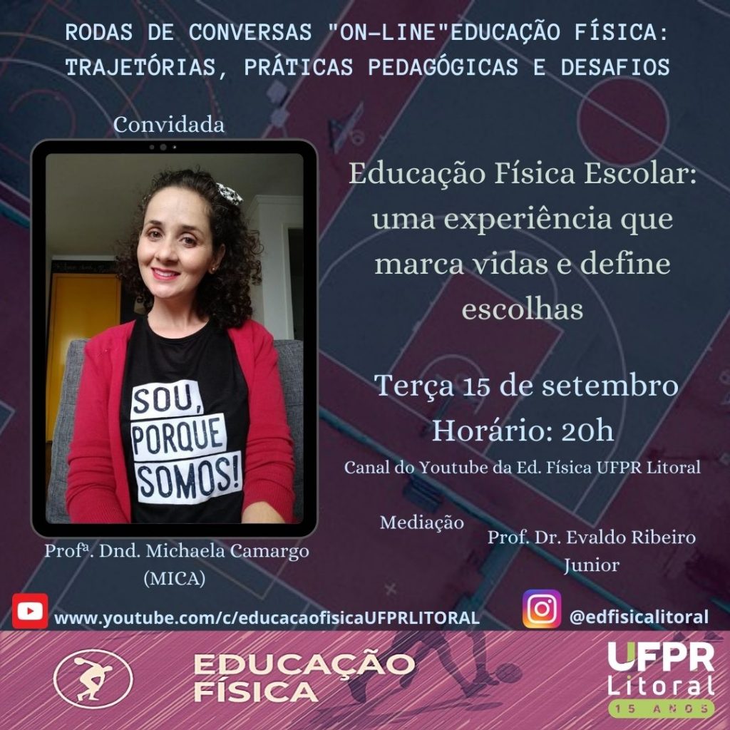 Nesta 3a feira, dia 15/9, às 20h, na Roda de Conversa On-Line – Educação Física: Trajetórias, Práticas Pedagógicas e Desafios, vamos receber a convidada Profa. Dnd. Michaela Camargo (Mica), que vai abordar o tema Educação Física Escolar: uma experiência que marca vidas e define escolhas.