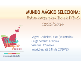 Seleção de estudantes para atuar no programa de extensão Mundo Mágico da Leitura 02 (duas) VAGAS COMO BOLSISTA FUNDAÇÃO ARAUCÁRIA – PIBIS02 (duas) VAGAS COMO VOLUNTÁRIO (A) FUNDAÇÃO ARAUCÁRIA – PIBIS Carga Horária Semanal: 12 horas ACESSE O EDITAL ⌨️ INSCRIÇÃO: Até às 14:00 horas do dia 02/10/2025 no link: https://forms.office.com/r/dUXr9Pk9kH 👥 SELEÇÃO: A entrevista […]